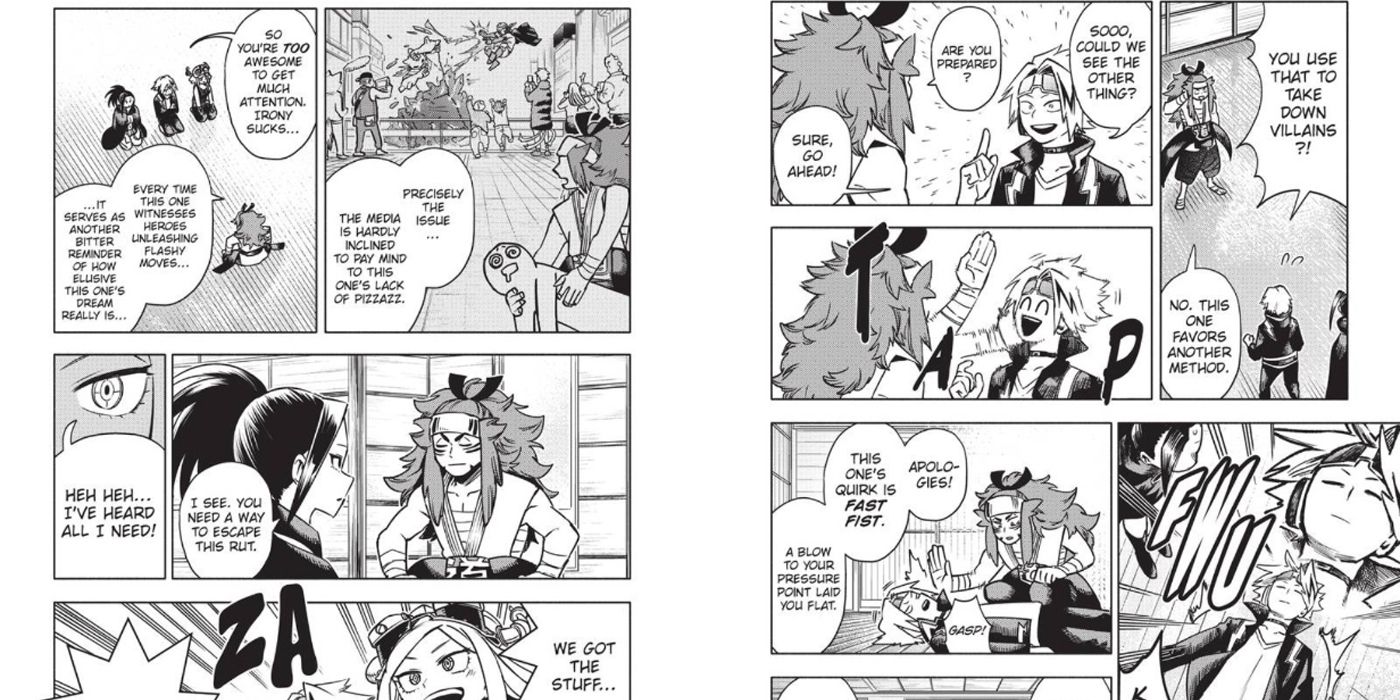 My Hero Academia: Misión de equipos Son pequeñas historias paralelas que generalmente se centran en un puñado de personajes, en este caso Momo, Kaminari y Hatsume, que a menudo trabajan juntos con un profesional o entrenan. En el capítulo #20 de Misiones de equipo, el trío es enviado a conocer a un héroe profesional que se especializa en artes marciales conocido como Blackbelt. Cuando llegan, descubren que Blackbelt está bastante deprimido y está considerando retirarse del trabajo de héroe.