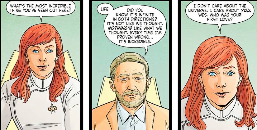 Lo que Wesley quiso decir exactamente con su declaración sobre el tiempo y el infinito es algo que los lectores deberán comprender, y ese es precisamente el punto. Kelly y Lanzing se han mostrado francamente felices de devolver la “ciencia ficción” a la literatura. viaje a las estrellaslanzando ideas locas a la pared una tras otra, sin empantanarse demasiado en la mecánica o la metafísica del asunto. En gran medida, esto ha sido una parte fundamental de lo que ha hecho que su serie sea tan atractiva durante mucho tiempo. Emigrar Los fanáticos en particular.