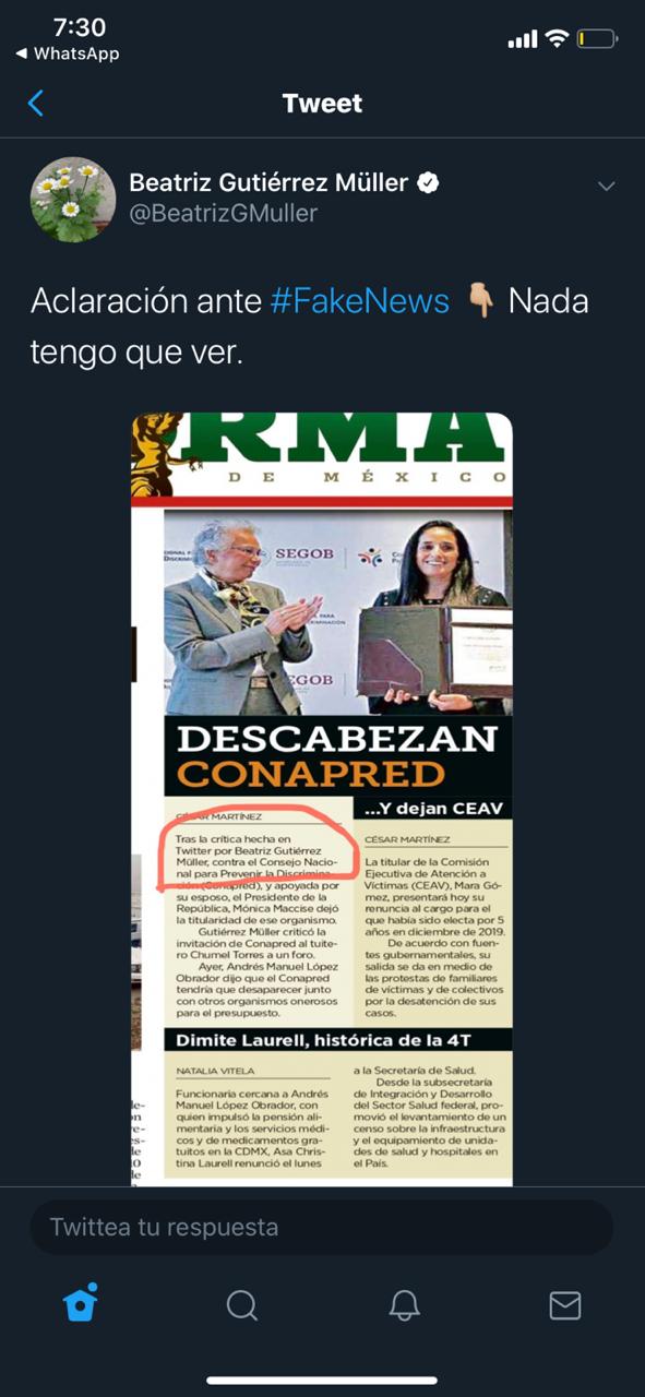 La esposa del presidente AMLO calificó como “fake news” lo publicado por el diario Reforma.
