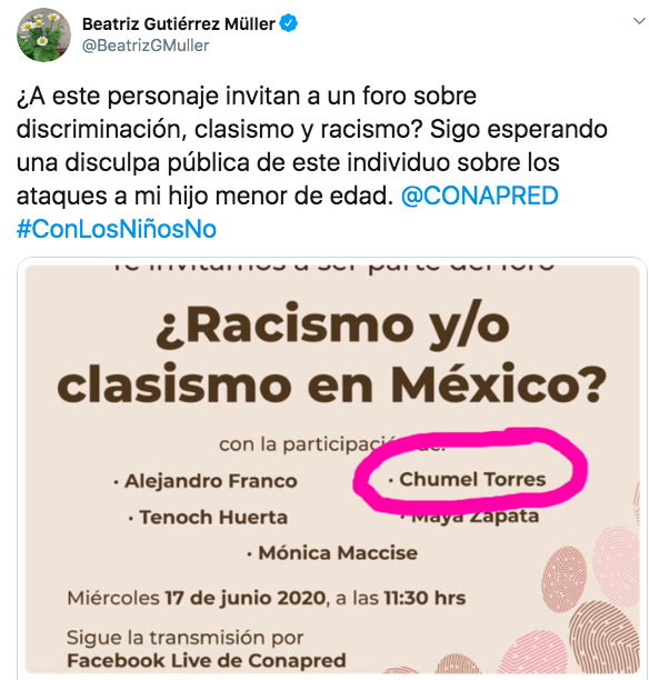 El pasado miércoles, tras darse a conocer la invitación a Chumel a dicho foro, Gutiérrez Müller tuiteó que seguí esperando una disculpa por parte de él, quien le puso un apodo a su hijo Jesús Ernesto.