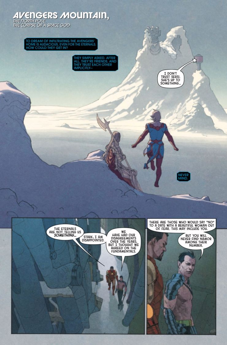 Dos de los Vengadores más fuertes de la historia, Namor y Sersi, disfrutan de una cita romántica mientras los Eternos se infiltran en la Montaña de los Vengadores.