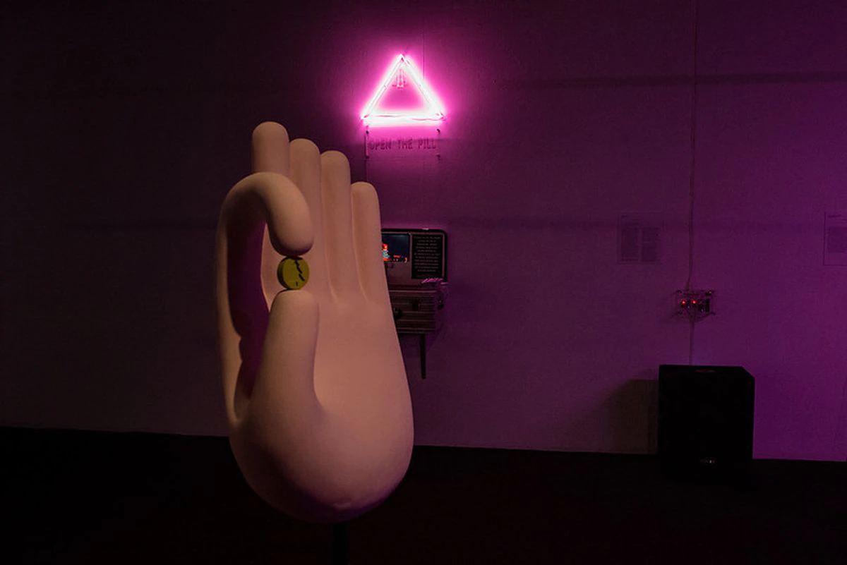 La propia experiencia que propone la exposición Narcohumanismo parte de la premisa de convertir el museo en un ácido comunal. Dividida en dos zonas, la muestra ofrece un recorrido tradicional en el que se exponen obras sobre las cartografías de la droga sobre los espacios —desde las fotos de construcciones de los narcos del cartel de Cali por Luis Molina Pantín o las 500 sustancias de todo tipo que compró en la deep web Daniel G. Andújar— y, por otro lado, una sala en la que la iluminación, las frecuencias de sonido y las propias obras inducen al visitante a experimentar y verse afectado por un estado alterado de la conciencia.