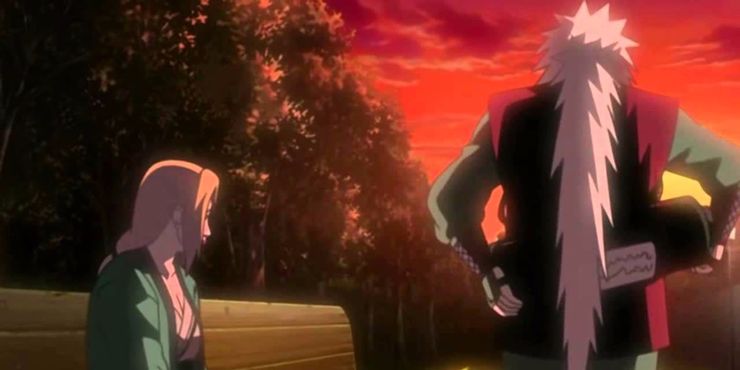 A pesar de haber estado en muchas misiones para Konoha antes, hay un peso en la última vez que abandona la aldea. Él y Tsunade consideran la relación que nunca han tenido y reconocen que esta vez, es posible que no regrese. Es una escena agridulce en la que Jiraiya asume mucha responsabilidad por tratar de aligerar el ambiente.