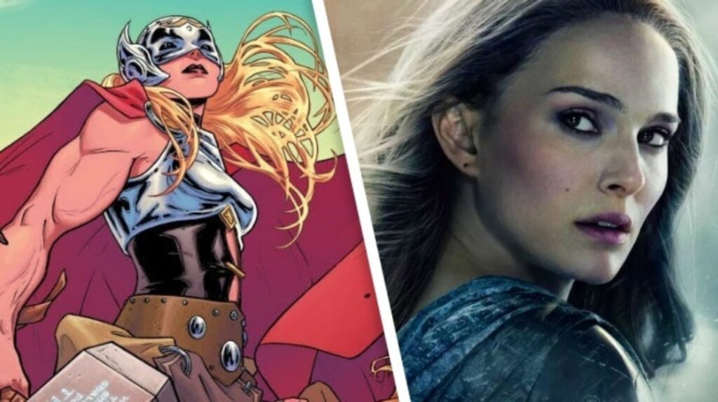 En los cómics, Jane se convierte en Thor en medio de un diagnóstico de cáncer de mama, y el poder de Mjolnir ayuda a recuperar su fuerza. Jane operó como el Mighty Thor durante varios años, pero finalmente se le dijo que continuar haciéndolo la mataría. Hizo ese sacrificio mortal mientras salvaba a Asgardia de Magog, y finalmente fue devuelta a la vida por Thor Odinson y Odin.