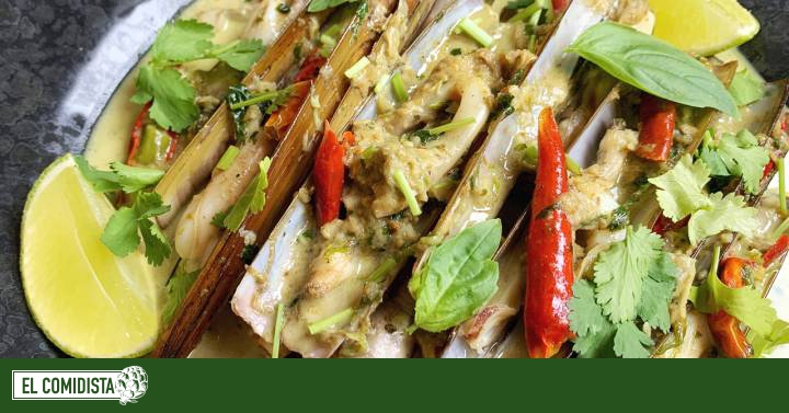 Los sabores de Tailandia combinan a la perfección con cualquier tipo de bivalvo. El frescor de las hierbas aromáticas, el cítrico de la lima y el lemongrass, el picante de los chiles y la cremosidad de la leche de coco conforman la base del tom yum nam kon, una sopa tradicional tailandesa que tiende a servirse con pollo o gambas pero lo tiene todo para hacer brillar almejas, navajas o mejillones. Como no me resulta demasiado cómodo tomarme una sopa con navajas, para esta receta reduciremos mucho la cantidad de caldo, hasta el punto de ser más bien un salteado con un poco de salsa inspirada en el plato que mencionaba antes.