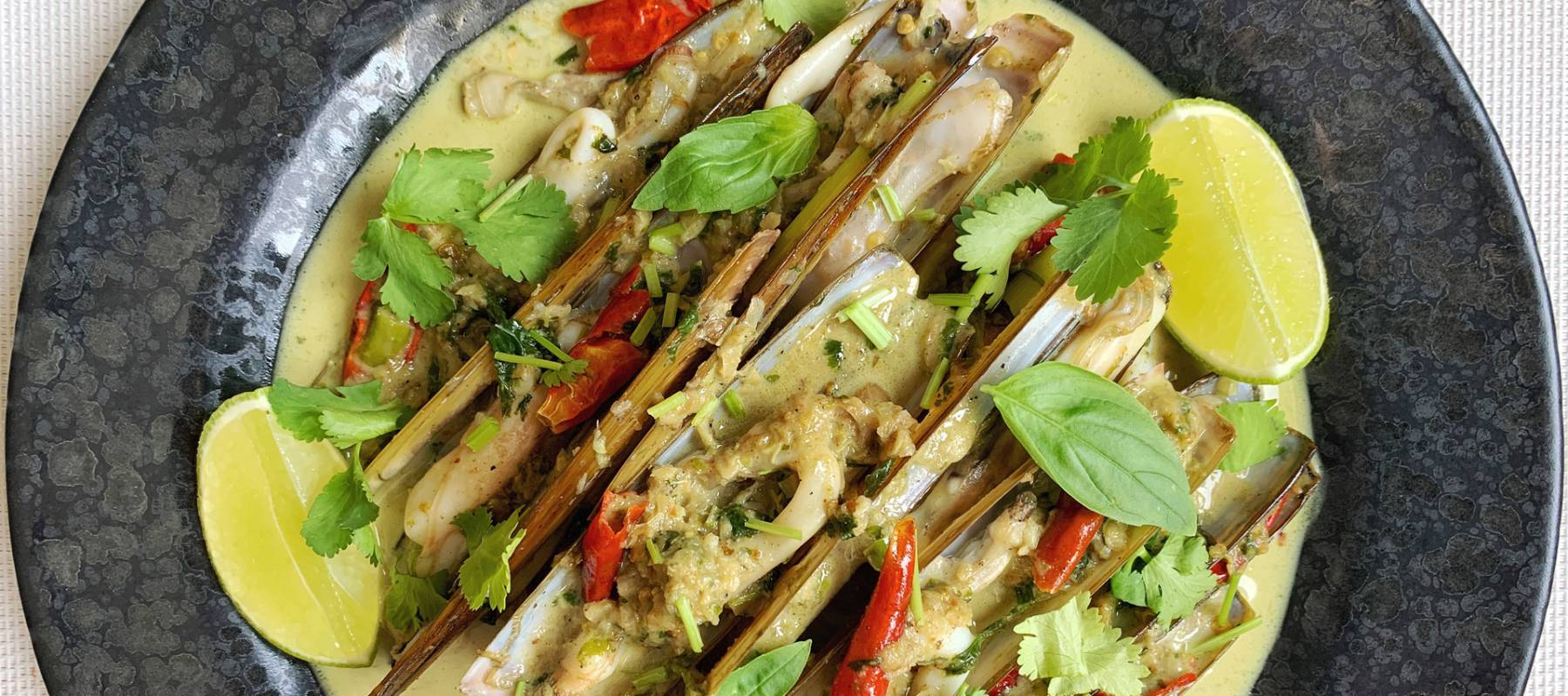 Estas navajas con curry tailandés y coco son perfectas como plato para acompañar arroces o fideos. Si te cuesta encontrar navajas frescas, no dudes en sustituirlas por mejillones o almejas de carril. Y si tienes un supermercado asiático a mano y una buena frutería, añade pasta de gamba fermentada, hojas de lima kaffir y lemongrass al curry casero para aportar aún más complejidad al mismo.