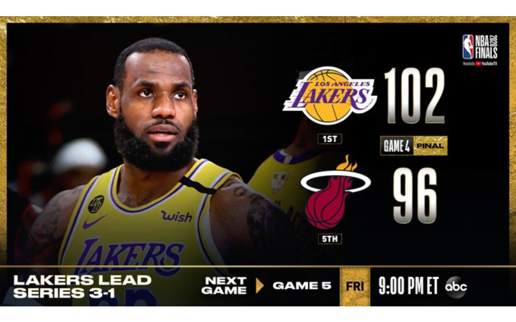 Lakers de Los Ángeles está a un paso de conquistar el Trofeo Larry O’Brien, primero desde el 2010,  tras vencer 102-96 al Heat de Miami y liderar3-1  la Serie Final de la NBA.