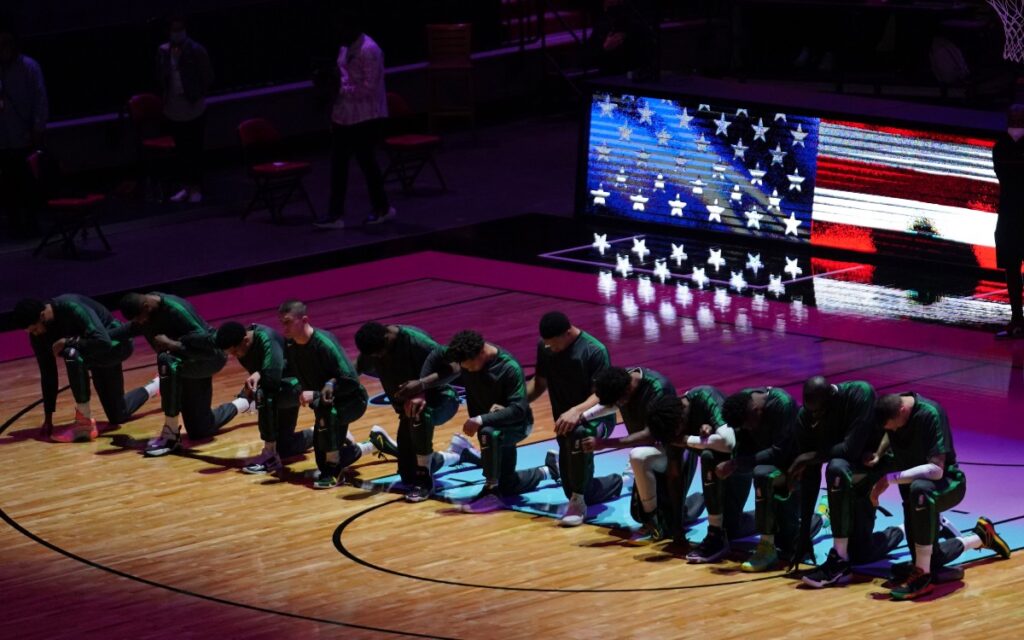 Con rodilla al suelo durante el himno estadounidense los basquetbolsitas protestaron contra la injusticia social y racial, así como contra los sucesos en Washington.