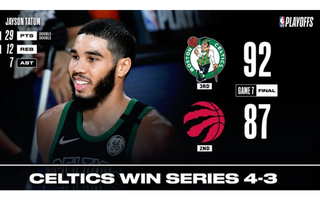Celtics de Boston está en la Final de la Conferencia Este de la NBA, tras vencer  92-87 a Raptors de Toronto en el séptimo y definitivo encuentro; así lo canadienses entregan la corona en Orlando, mientras los bostonianos se medirán al Heat de Miami en la siguiente ronda.