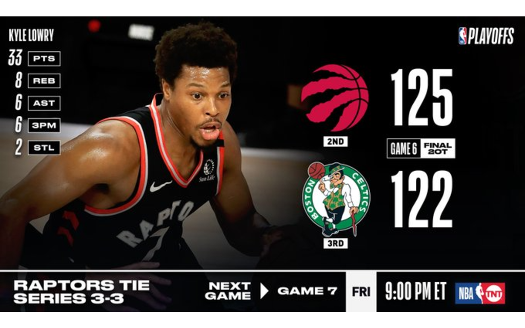 Kyle Lowry leads Toronto to Game 7!@Klow7‘s 33 PTS (6 3PM), 8 REB, 6 AST and game-sealing bucket helps the defending champion @Raptors win in 2OT and send the series to a Game 7! #NBAPlayoffs
