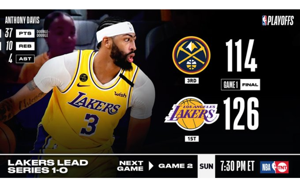 Lakers de Los Ángeles tomó ventaja 1-0 en la Final de la Conferencia Oeste de la NBA al imponerse 126-114 a Nuggets de Denver, gracias a la buena actuación de Anthony Davis, quien anotó 37 puntos, en un encuentro que dominaron desde el segundo cuarto y en el que llegaron a gozar de 27 puntos de ventaja.