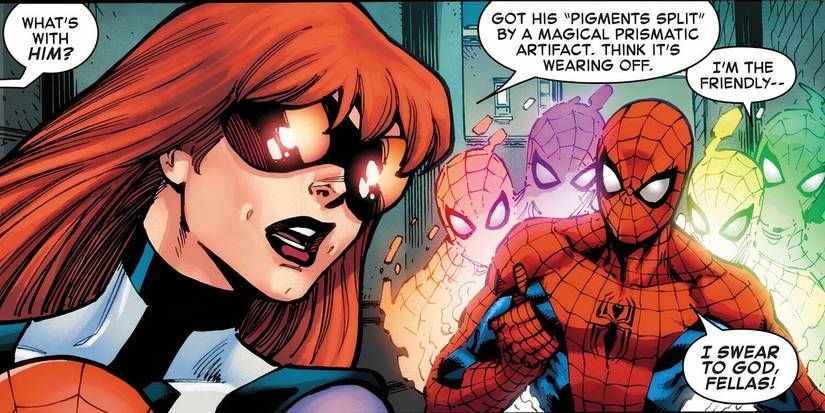 Usando sus poderes, este villano Spidey dispersa los colores de Spider-Man, mostrando a Spider-Men más allá del icónico rojo y azul. Desde aquí, una gran cantidad de El colorido Spider-Man en combinaciones como verde y negro, así como amarillo y verde, le da a Spider-Man la opción de expandirse hacia un mito al estilo de Green Lantern. con varios colores y personalidades.