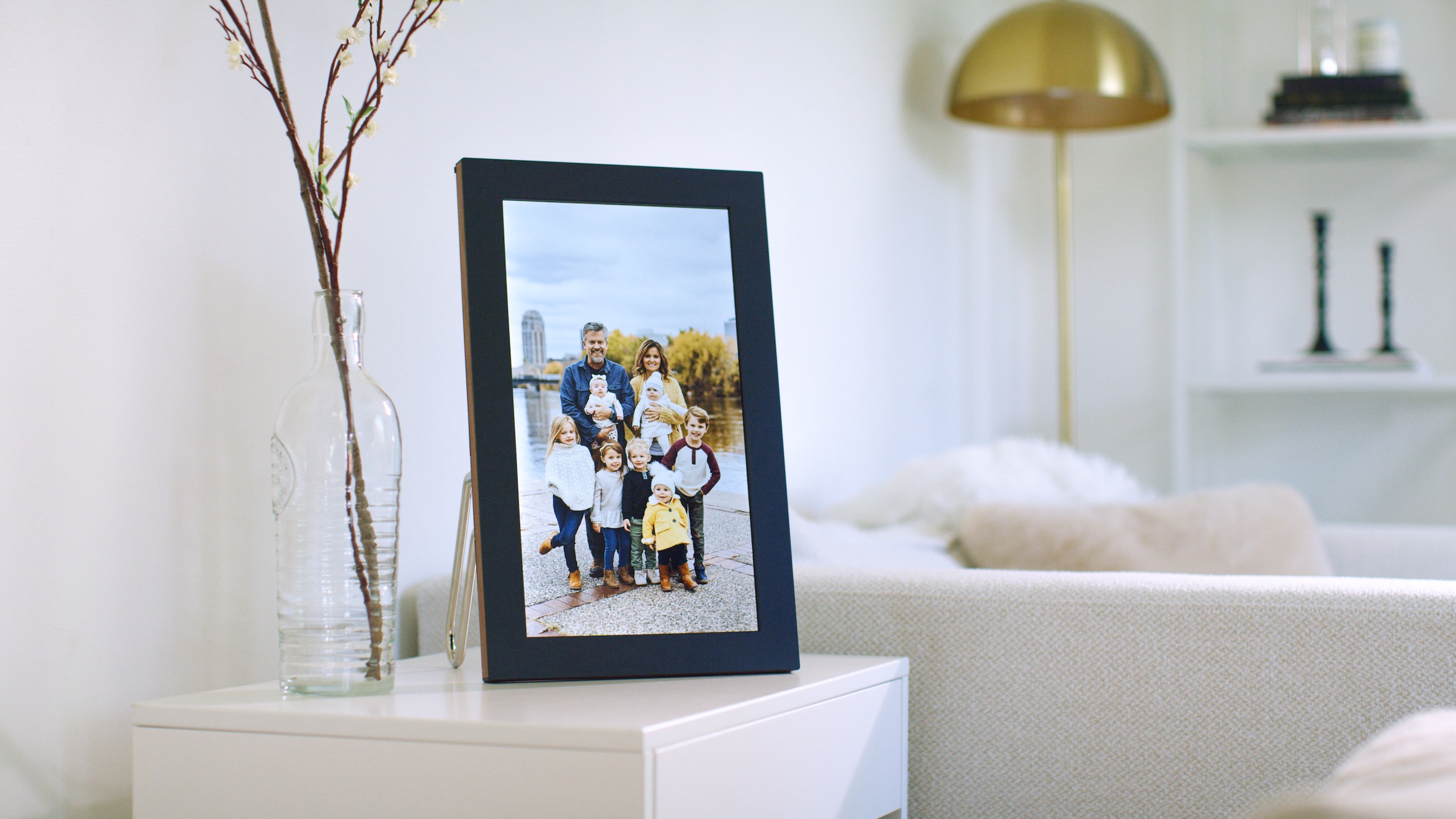 El nuevo marco de fotos incluye sensores de luz ambiental, así como control por gestos para ver los detalles detrás de las fotos y para navegar entre imágenes en presentaciones de diapositivas. Tiene un soporte incorporado, que se puede quitar para montar en la pared, y funciona tanto en vertical como en horizontal, y girará automáticamente a ambos y mostrará solo los tipos de fotos en un álbum que coincidan con esa orientación.