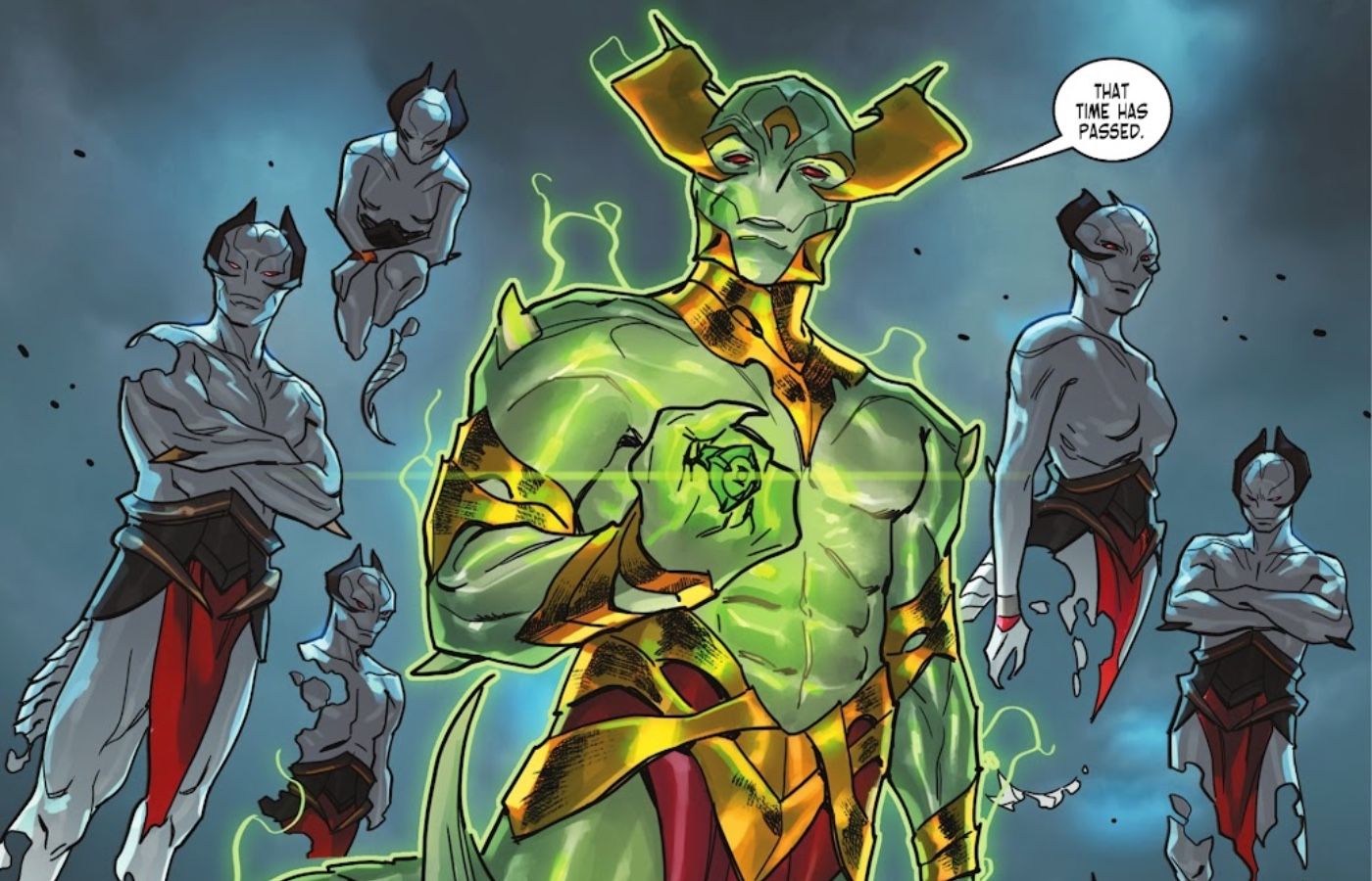 Caballeros oscuros de acero # 10 por Tom Taylor, Yasmine Putri y Arif Prianto, encuentra al recién revelado J’Onn J’Onnz detallando a sus captores y posibles aliados, Kal-el, Bruce Wayne y Diana, la caída de su raza, el marcianos verdes, a manos de los viciosos marcianos blancos. Al observar su poder y salvajismo, está claro que estos marcianos alternativos son tan poderosos como los enemigos a los que se ha enfrentado la Liga de la Justicia en la continuidad principal. Pero el final del problema sube la apuesta a un nivel completamente nuevo cuando Protex, el líder de la horda marciana blanca, asesina a Luthor, se apodera del anillo de poder Green Lantern del humano y amenaza a toda la Tierra en el proceso.