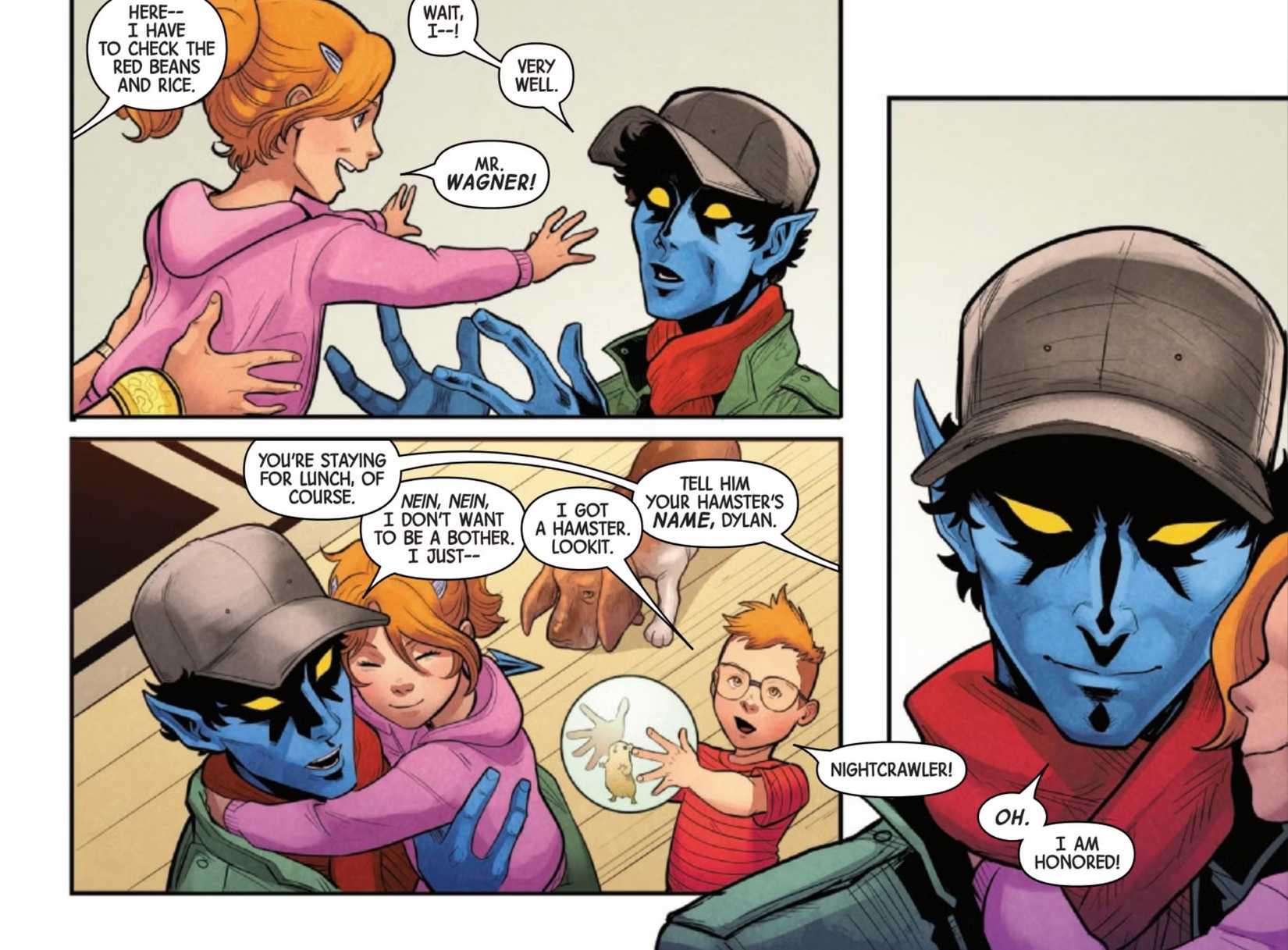 En Uncanny X-Men #18escrito por Gail Simone y dibujado por Luciano Vecchio, Nightcrawler visita la casa del aliado humano Makenzie Deneer y sus hijos, y el pequeño hijo de Makenzie revela que llamó a su hámster después del héroe azul difuso.