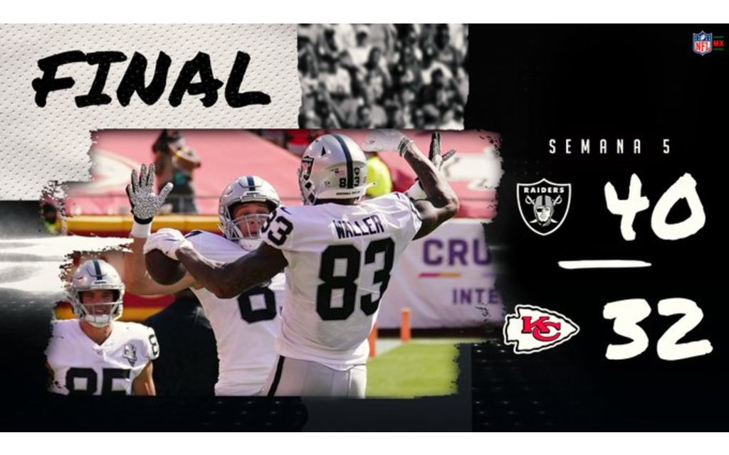 Raiders de Las Vegas (3-2) dio la sorpresa en la Semana 5 de la NFL al vencer 40-32 a los actuales campeones Jefes de Kansas City (4-1) en Arrowhead Stadium