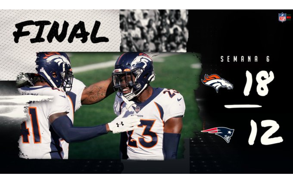 Broncos de Denver se impuso 18-12 a Patriotas de Nueva Inglaterra, desafío correspondiente a la Semana 6 de la NFL, celebrado este domingo en Gillette Stadium de Foxborough, Massachusetts, donde brilló el pateador Brandon McManus, quien conectó seis goles de campo para darle la victoria a su escuadra.