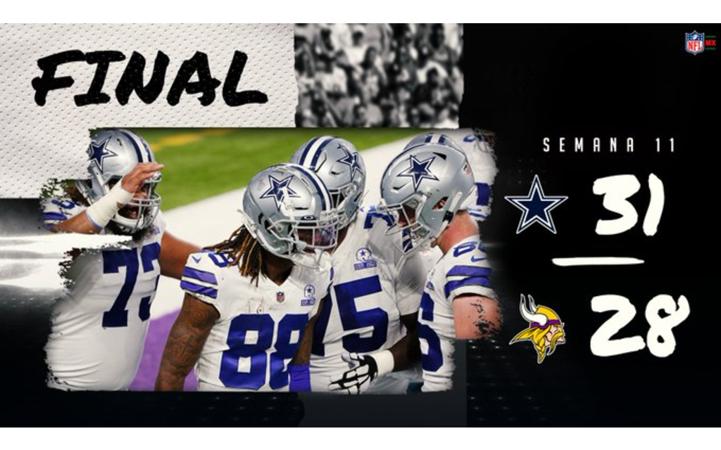 Vaqueros de Dallas (3-7) está a solo medio juego del liderato de la División Este de la Conferencia Nacional, luego de dar la sorpresa al vencer 31-28 a Vikingos de Minnesota (4-6), encuentro válido por la Semana 11 de la NFL, celebrado este domingo en el US Bank Stadium.