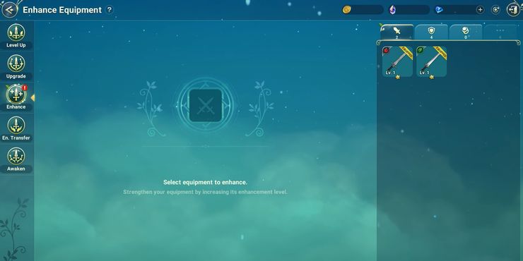 Hay cuatro técnicas distintas en Ni No Kuni: Mundos cruzados para la actualización de equipos. Estas técnicas incluyen Level Up, Upgrade, Enhance y Awaken. Llevar a cabo estos métodos en el equipo de uno mejorará las capacidades de las armas o armaduras, aumentando directamente el poder de combate. En primer lugar, los jugadores pueden subir de nivel su equipo de forma similar a como suben de nivel su personaje o rango. Naturalmente, el proceso costará la moneda del juego, pero los aventureros también deberán obtener recursos de nivelación generales o especiales, según el tipo de equipo que se mejore. Además, las armas tienen materiales de nivelación únicos basados en elementos que pueden proporcionar una bonificación cuando se aplican a armas con el mismo elemento.