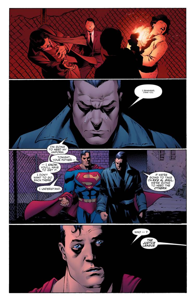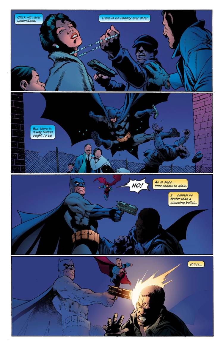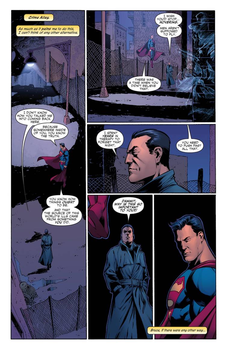 El número 16 lo demostró cuando Clark trajo a Bruce, que no era un superhéroe, de regreso a Crime Alley y lo obligó a enfrentar el trauma central de Batman. - A pesar de líneas de tiempo alternativas en las que Batman no fue testigo de la muerte de sus padres, aun así se convirtió en Batman después de su encuentro con Superman en Crime Alley, aunque careció críticamente de los años de entrenamiento dedicado y experiencia por los que Batman es famoso, lo que lo hace más vulnerable de lo normal. .