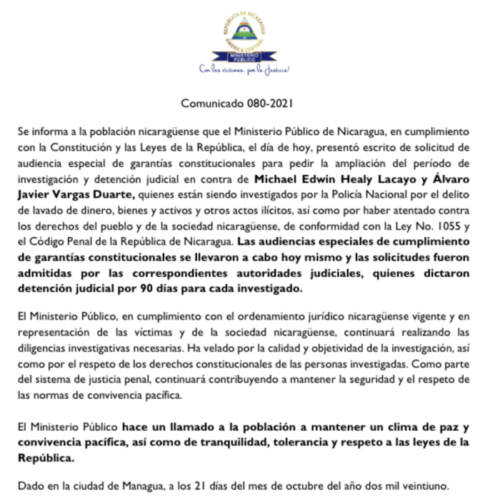 La Policía Nacional informó, en un comunicado, que detuvo al presidente y vicepresidente del Consejo Superior de la Empresa Privada (COSEP), Michael Healy y Álvaro Vargas, respectivamente, quienes “están siendo investigados por el delito de lavado de dinero, bienes y activos”.