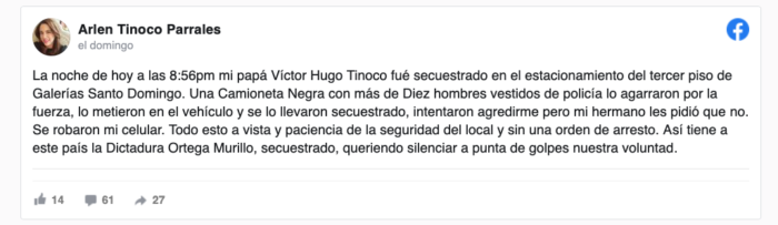 Tinoco, de 68 años, fue secuestrado la noche del domingo en el estacionamiento de un centro comercial de Managua por “unos 10 hombres encapuchados y vestidos de civil” que se lo llevaron en un vehículo, dijo una de sus hijas quien fue testigo de la captura.