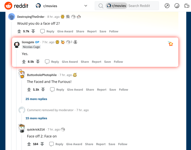 En un AMA de Reddit, cuando se le preguntó si Cage regresaría para la secuela, respondió con una palabra “.” Aunque no está claro si se le ha pedido a Cage que repita su papel, el hecho de que Cara a cara 2 es una secuela directa que deja la puerta abierta para el regreso de Troy, a pesar de su aparente muerte al final de la película original. Pero con la cirugía de cambio de cara que se muestra en la primera película, es completamente posible que la cara de Troy pueda ser injertada en el cuerpo de un nuevo personaje. Vea la captura de pantalla de la AMA a continuación: