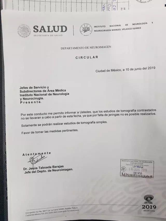 En redes circuló un oficio en el que se informaba que los estudios de tomografía contrastados no se llevarán a cabo por falta de jeringas, lo cual desmiente el director médico de esta institución.