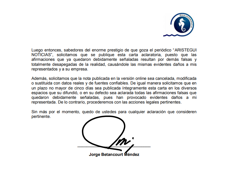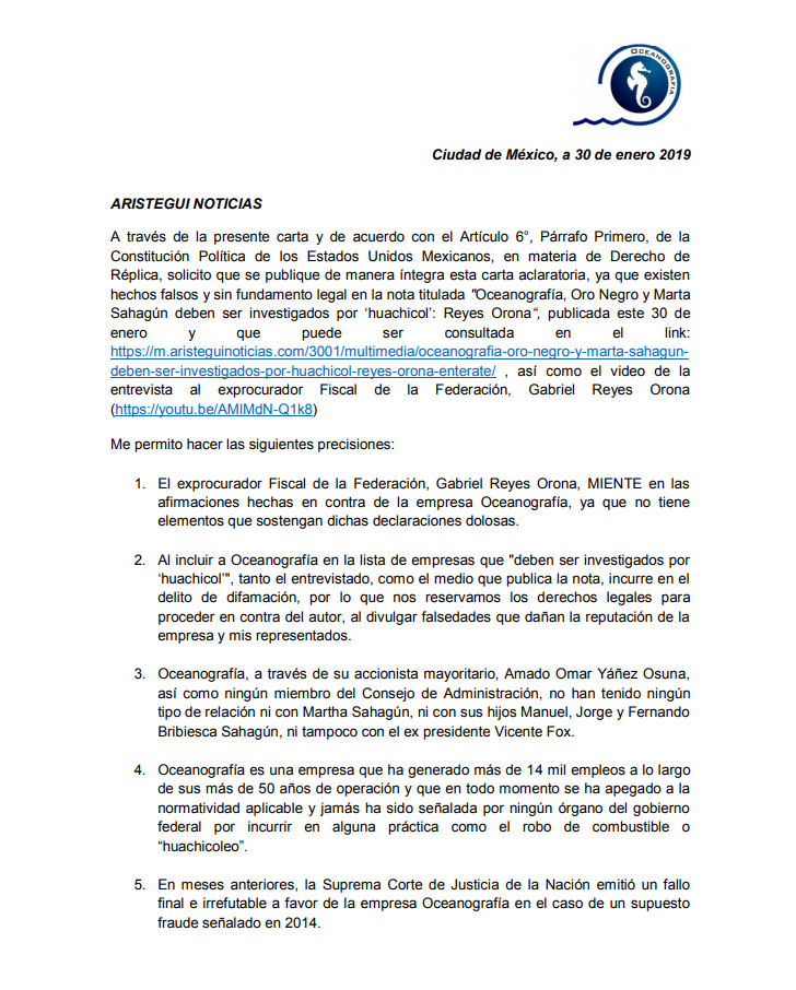 En respuesta a la nota “Oceanografía, Oro Negro y Marta Sahagún deben ser investigados por ‘huachicol’: Reyes Orona (#Entérate)”, la empresa envió una carta aclaratoria, en la cual asegura que Reyes Orona miente.
