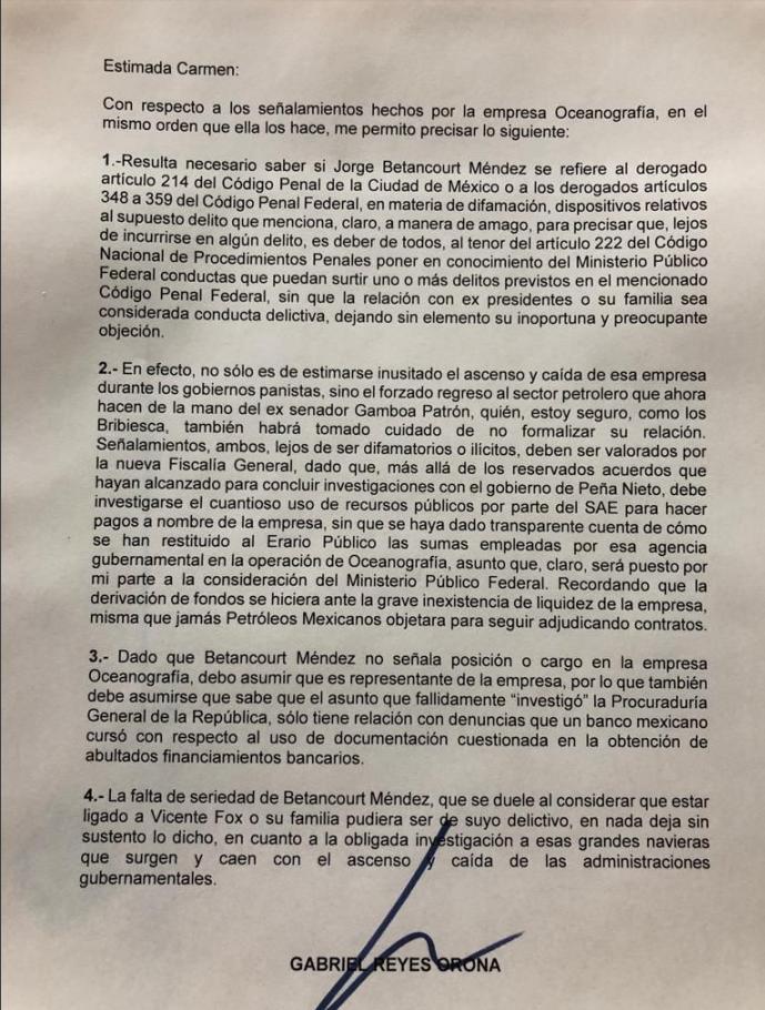 En respuesta a la nota “Oceanografía, Oro Negro y Marta Sahagún deben ser investigados por ‘huachicol’: Reyes Orona (#Entérate)”, la empresa envió una carta aclaratoria, en la cual asegura que Reyes Orona miente.