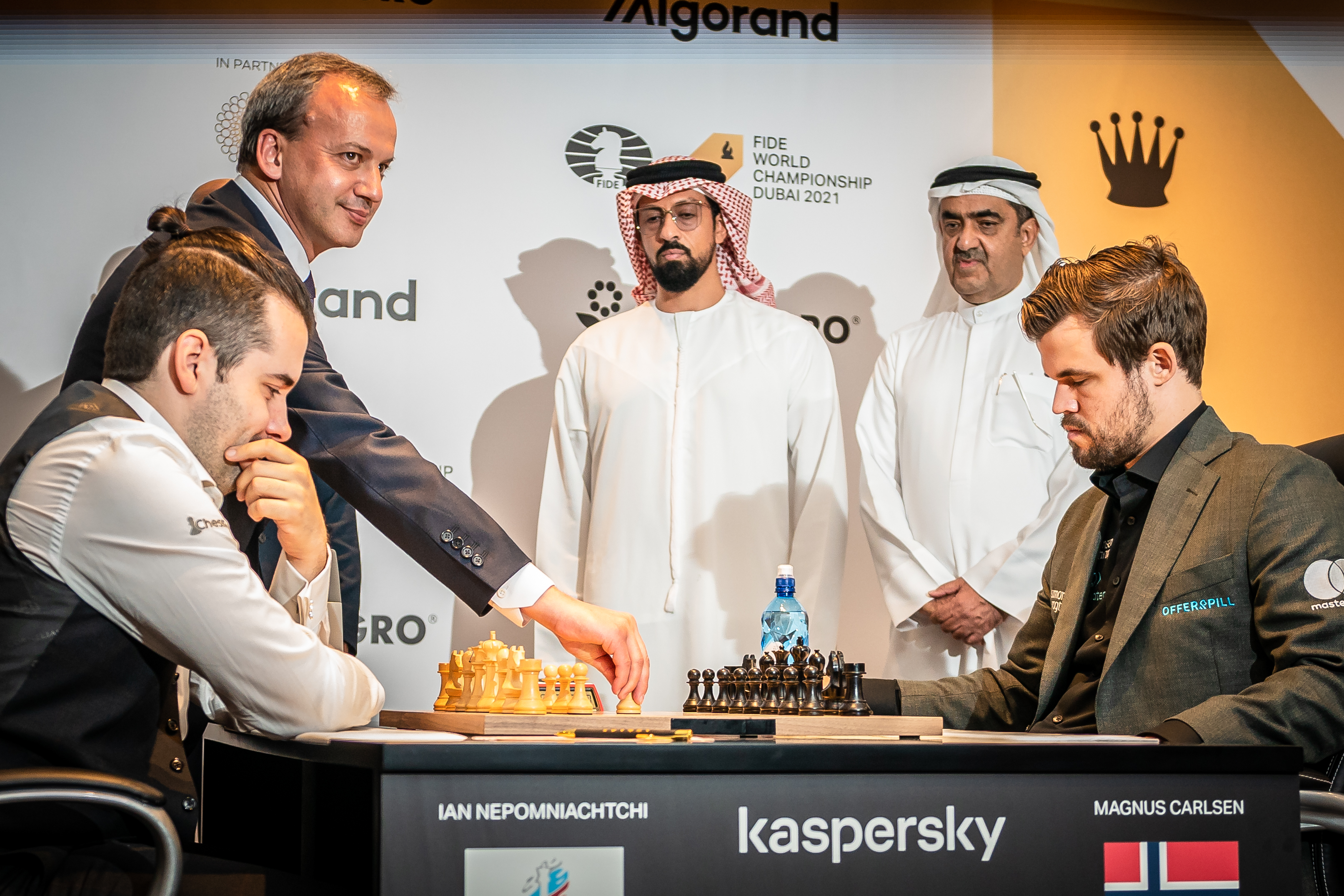 Los prolegómenos fueron interesantes. Niepómniachi llegó con 20 minutos de antelación al escenario, acristalado y opaco: los jugadores no pueden ver a los espectadores para evitar que uno de ellos, armado en su teléfono móvil con cualquiera de los programas de ajedrez que calculan millones de jugadas por segundo, pueda transmitir alguna por señas. Dado que es su primera final de un Campeonato del Mundo, todo indica que lo hizo para acostumbrase al ambiente: una nube de fotógrafos que no dejaban de disparar, la sensación especial de disputarle la corona al rey… Y tres minutos después se marchó, para no volver hasta muy poco antes de la hora de comienzo.