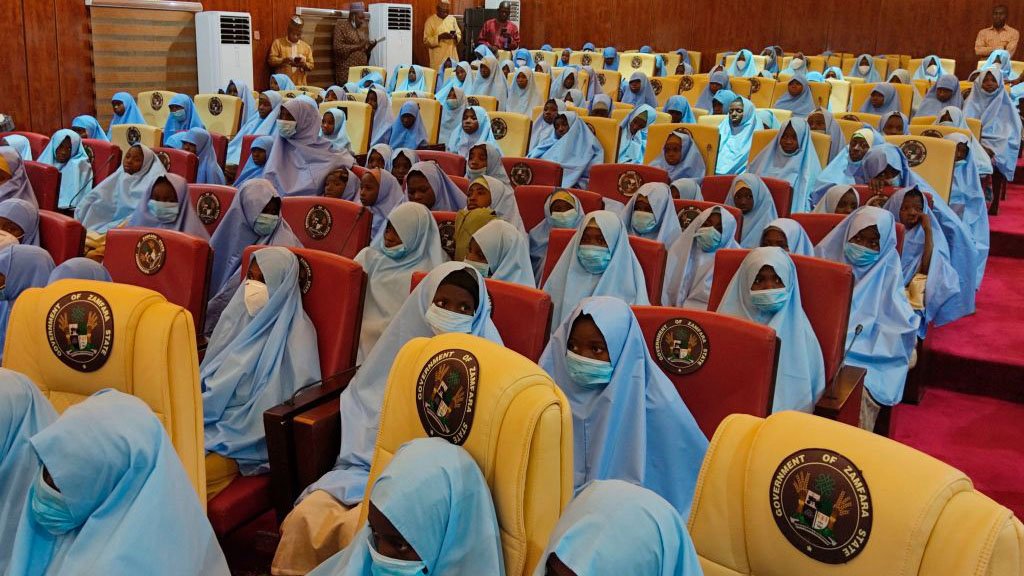 Un reportero de Associated Press vio cientos de niñas, descalzas y vestidas con hiyabs de color azul claro, sentadas en la oficina de la Casa de Gobierno en Gusau.