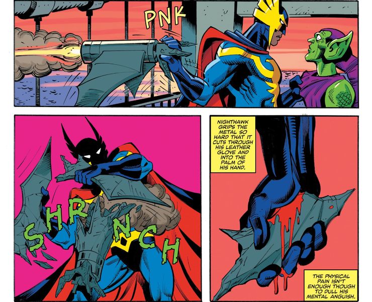 En uno de los últimos números de Marvel Comics relacionados con Héroes renacidos, Nighthawk acaba de poner la escena del planeador Goblin del primer Sam Raimi Hombre araña película de la vergüenza. En Heroes Reborn: Doble acción # 1, se explora el pasado del pastiche de Batman de Marvel conocido como Nighthawk, viendo al oscuro justiciero perder a su compañero Falcon, quien servía como su análogo de Robin de DC. Como resultado, Nighthawk casi se convierte en un asesino en este tema debido a su rabia y enojo, y ni siquiera está en fase cuando el Goblin lo pone en una situación similar a la del Hombre Araña de Tobey Maguire en la película de 2002.