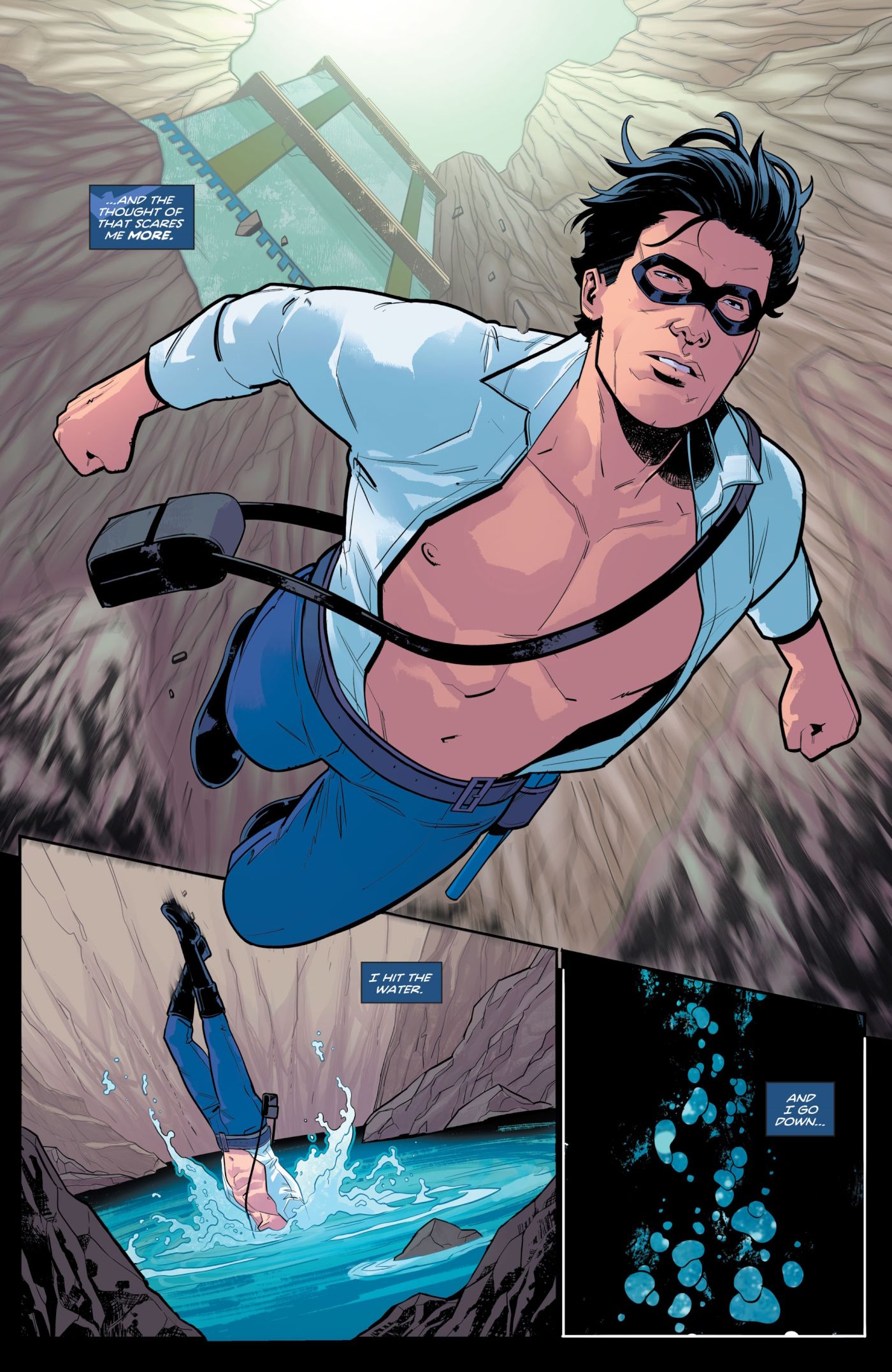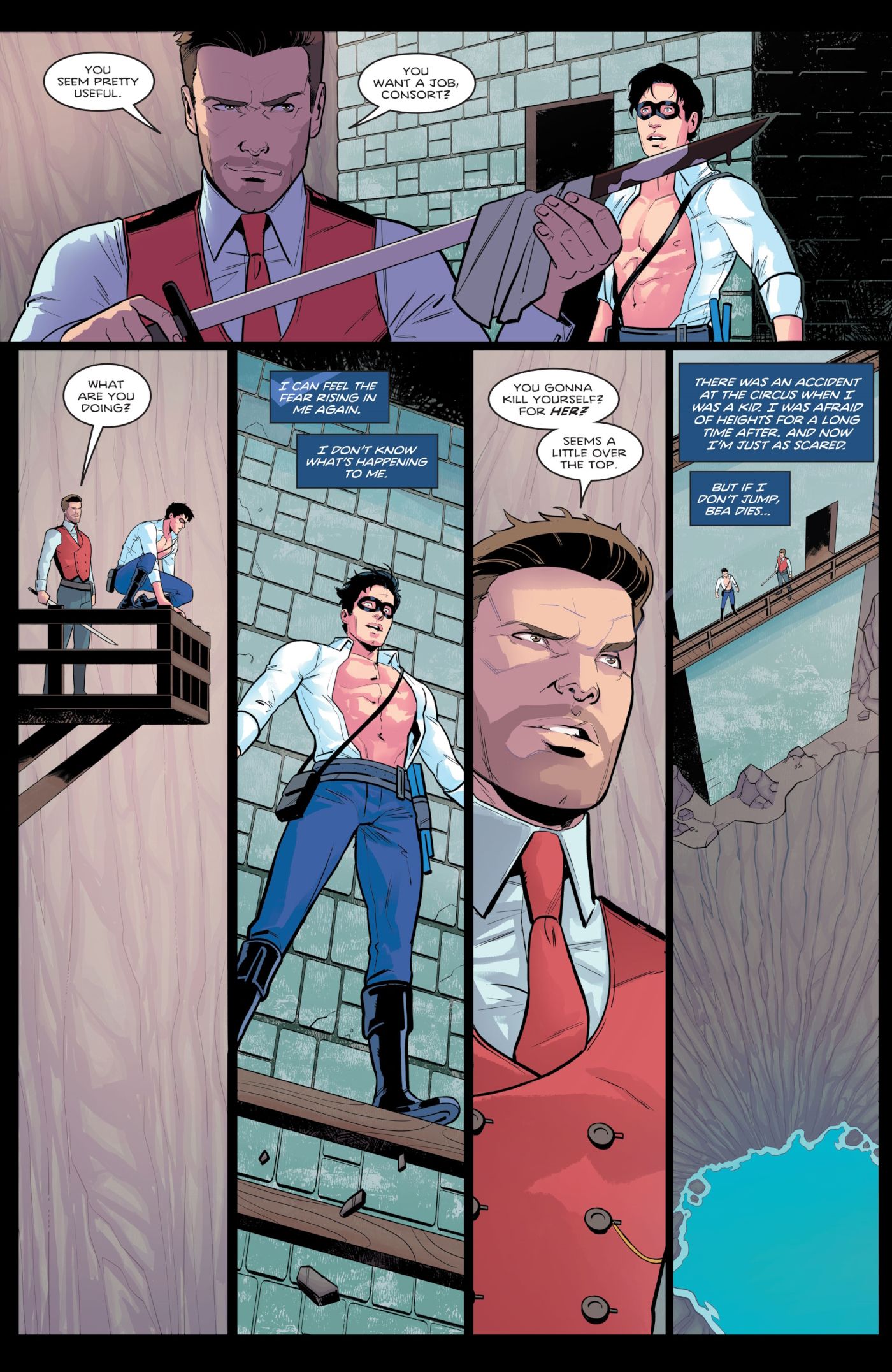 Nightwing es capaz de superar un gran miedo en Ala noche #109 de Tom Taylor, Stephen Byrne, Adriano Lucas y Wes Abbott. Después de que Bea Bennett es apuñalada frente a él y arrojada al océano, Nightwing se acerca para saltar tras ella.