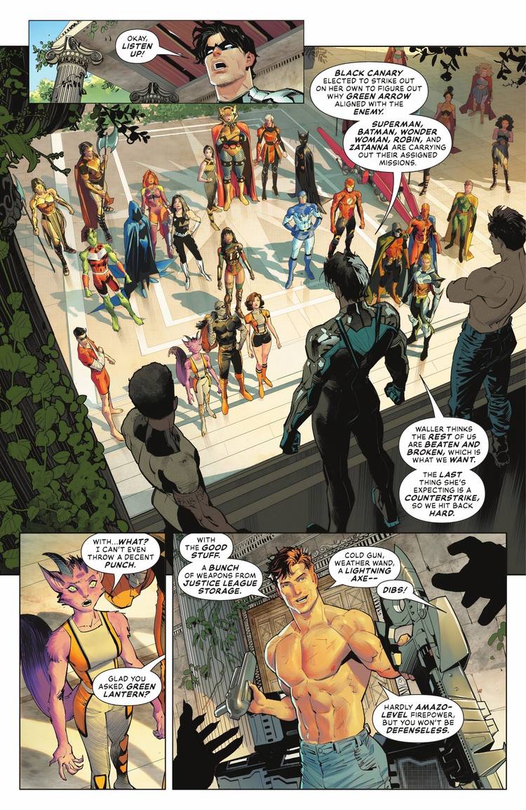 Con todos los héroes perdiendo sus poderes, necesitan una forma de luchar contra el abrumador ejército de Waller. Nightwing le pide a Hal Jordan que reparta armas de la armería de la Liga de la Justicia.lo que provocó que todos los héroes en el área tomaran armas y otras armas pesadas, todo bajo la dirección de Nightwing.
