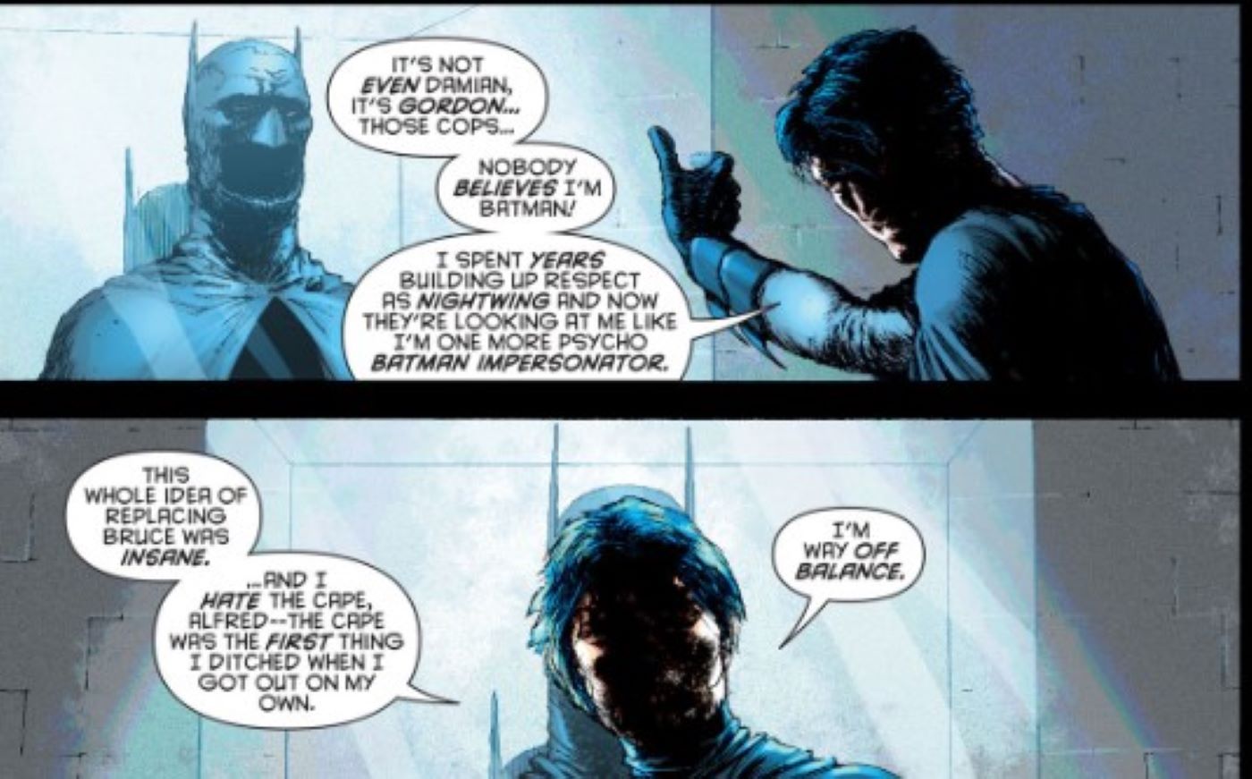 En batman y robin #2, Dick experimenta una crisis de un cuarto de vida cuando inesperadamente asume el manto de Batman y al mismo tiempo asume la responsabilidad de ser mentor del hijo de sangre de Bruce, Damian al Ghul. En un momento de estrés, Dick le confía a Alfred que se siente abrumado por tener que lidiar con un GCPD que no lo toma en serio y, para aumentar sus frustraciones, expresa su desdén por la capa, lo que le desconcierta. balance. Esta revelación sobre la capa es particularmente intrigante ya que aborda una preocupación válida más que un obstáculo imaginario.