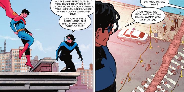 Al llegar ataviado con su atuendo de Superman, Jon le pregunta a Nightwing cómo supo que era él debajo de la máscara de dominó antes, a lo que Dick responde que es “un detective bastante bueno”, y le da a Jon una respuesta que es obvia. Continuó diciendo: “Las máscaras son efectivas, pero no puede confiar solo en ellas para ocultar su identidad. Necesitas otra voz cuando usas una”, Nightwing le dice sucintamente a Jon que al usar una voz de murciélago, como lo ha hecho cada actor que interpreta a Batman en las películas durante décadas, puede mantener oculta su identidad secreta de manera más efectiva. de aquellos que le harían daño.