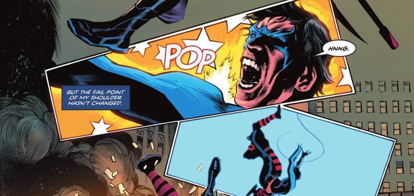 Si bien el cable de Nightwing pudo haber soportado los 280 kilos adicionales, el hombro de Dick no pudo soportar la tensión. Por eso, su reconocimiento de que “El punto de falla de [his] El hombro no ha cambiado.”Además de este monólogo interior, El arte del cómic muestra vívidamente el hombro de Nightwing saliendo de su lugar.acompañado de la onomatopeya “ESTALLIDO. ” Con su hombro fuera de servicio, tanto él como KGBeast caen tres pisos hasta el suelo, donde un auto estacionado amortigua su caída. Esto subraya la verdad perdurable de que, a pesar de todas las mejoras que la Bat-Familia otorga a sus dispositivos, las limitaciones del cuerpo humano siguen siendo un obstáculo formidable.