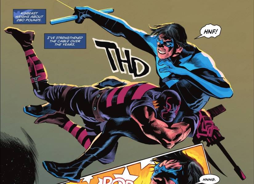 En este momento, Dick reflexiona sobre cómo ha reforzado el cable a lo largo de los años, sugiriendo que puede soportar su peso más los 127 kg adicionales de Anatoli. Sin embargo, a pesar de los mejores esfuerzos de Dick por mantener su agarre en la garra, Tanto el héroe como el villano caen a la calle debido a un defecto fatal: las limitaciones del cuerpo muy humano de Nightwing.