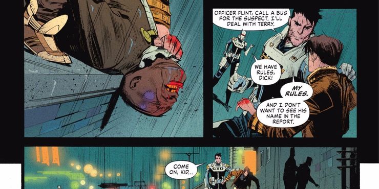 Como los fanáticos aprendieron en el primer número de esta serie, Terry McGinnis trabaja con Derek Powers para recuperar secretos ocultos de la batcueva de Bruce Wayne, los cuales Powers espera robar y sacar ganancias. Después de la adquisición de la compañía de Wayne por parte de Powers, colgó a Bruce para que se secara cuando salió a la luz que él era Batman y Bruce fue enviado a prisión debido a su vigilancia. Sin embargo, Powers no había terminado de llamar a Bruce por todo lo que valía, por lo que reclutó a Terry McGinnis para irrumpir en la Baticueva y robar un traje que incluso Batman estaba demasiado asustado para usar: el icónico traje de Batman Beyond. Si Nightwing hubiera hecho su trabajo como oficial de la ley en lugar de como un secuaz de su jefe multimillonario, es posible que Terry McGinnis nunca se hubiera convertido en Batman.