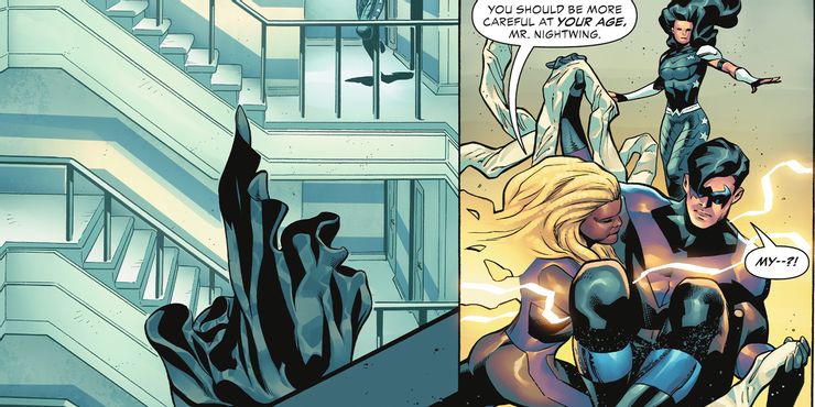 Parece que la próxima generación puede ser la primera en señalar el hecho de que incluso Nightwing no puede escapar de la marcha del tiempo. Aunque obviamente todavía se mantiene firme en el papel de liderazgo en el que a menudo ha caído y está usando su conocimiento y destreza para levantar una nueva era de héroes, termina haciendo algo un poco impulsivo que lleva a algunas burlas moderadas por parte de un joven velocista. . En este número, del escritor Tim Sheridan y el artista Rafa Sandoval, Nightwing descubre que su máscara Red X ha desaparecido. No puede encontrarlo en ningún lado y no sabe dónde podría haber ido hasta que encuentra a alguien aparentemente pirateando la computadora de la academia mientras usa el disfraz de Red X. En la persecución del culpable enmascarado, se agarra a una manguera de incendios para bajar unos niveles y capturarlos, pero no tiene en cuenta el hecho de que la manguera es demasiado larga para aterrizar de forma segura (lo que Donna Troy también señala un momento tarde). Afortunadamente para él, Bolt, un velocista que no deja que una discapacidad la detenga, llega justo a tiempo para evitar que aterrice de bruces en el suelo.