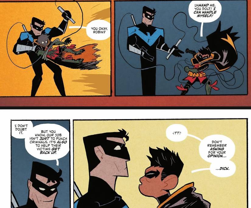 Sin que Robin lo supiera, Nightwing había estado observando toda la escena y le sonrió con orgullo al niño, feliz de que Damian tomara en serio sus palabras y las aplicara. Esta interacción con la anciana demuestra ¿Cuánto más efectiva es la suave corrección de Dick al comportamiento de Damian en comparación con las duras reprimendas de Batman? y descuido. Es evidente que Nightwing sabe cómo tratar a Damian de una manera amorosa que no disminuye su autoestima y al mismo tiempo corrige su comportamiento, a diferencia de Batman. Este momento subraya la capacidad de Dick para conectarse con Damian y guiarlo, lo que demuestra su capacidad para criar al niño.