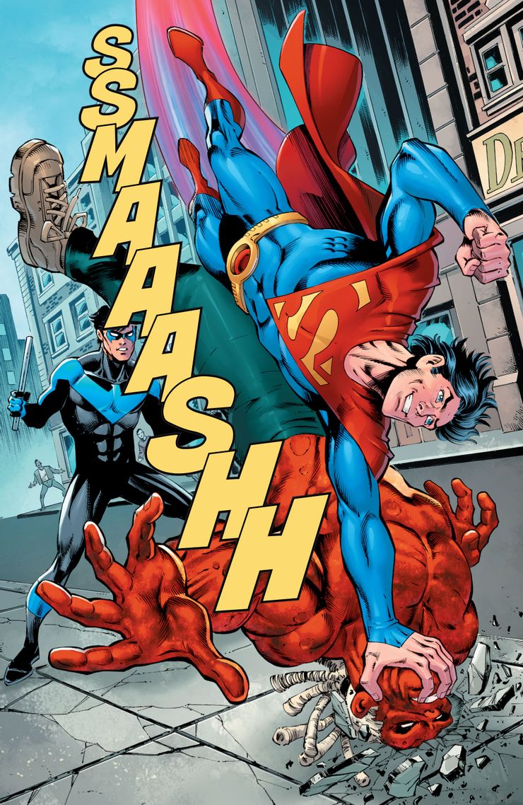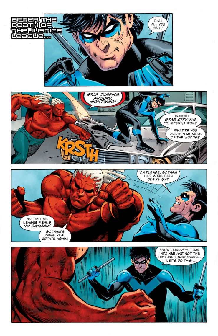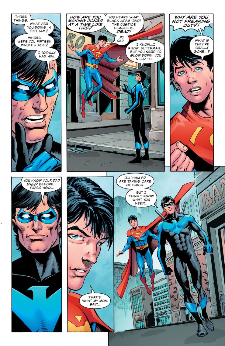 En Liga de la Justicia: Camino a la Crisis Oscura “Team Up” del n. ° 1 de Joshua Williamson y Dan Jurgens, Nightwing es interrumpido por un Jon Kent en pánico, que acaba de enterarse de las aparentes muertes de la Liga. Dick sienta a Jon y lo consuela; después de pedir algo de comida reconfortante, su almuerzo se ve interrumpido por otra emergencia que exige el poder combinado del Hombre de Acero y el Hijo Favorito de Blüdhaven. Como miembro de Bat-Family, es obvio que Nightwing puede defenderse en una pelea y servir como un gran detective cuando la ocasión lo exige. Si bien estos fueron aspectos formativos clave de su tutela bajo Batman, su interacción con un angustiado Jon muestra tanto la lección más importante de Batman como su mayor fortaleza personal: la compasión. La reacción inicial de Dick es un poco tosca ya que ha vivido lo suficiente como para ver morir a varios héroes (incluido Batman) y volver a la vida. Nightwing cree que esta vez no será diferente y, como tal, no hay nada de qué preocuparse.