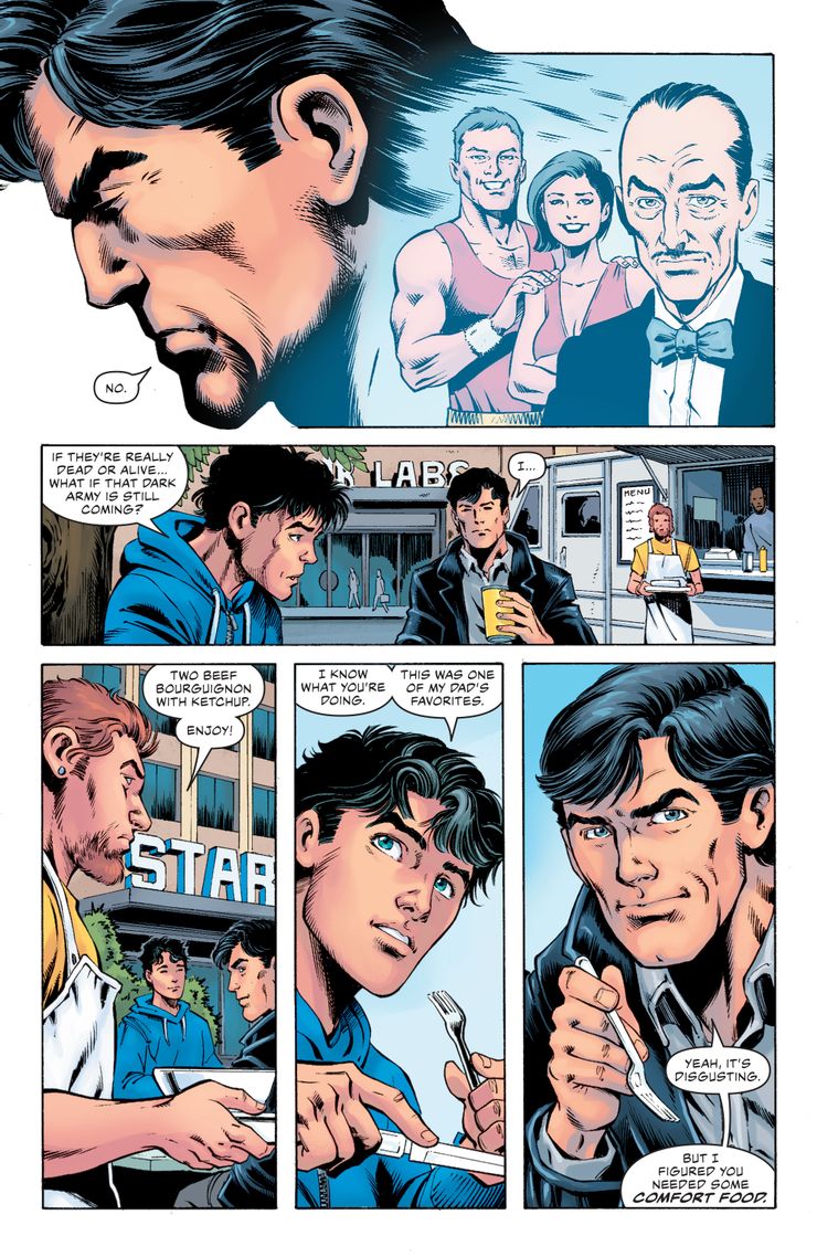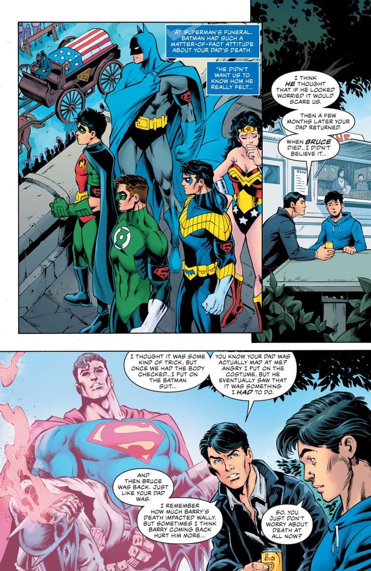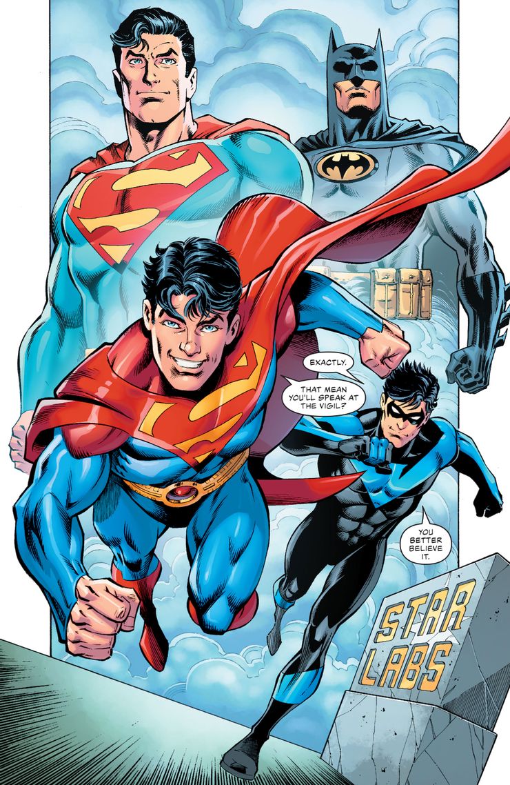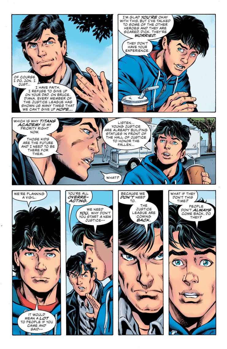 Nightwing rápidamente se da cuenta de que su actitud y citar precedentes no hacen lo suficiente para ayudar a Superman, y adopta un enfoque más compasivo para consolar al Hombre del Mañana. Dick admite sus propios momentos de duda y los momentos en los que realmente luchó con la muerte de sus seres queridos y su eventual regreso, relacionándose con Jon y demostrando que esas ansiedades y miedos son normales, y que la Liga ha demostrado que pueden aferrarse siempre a la esperanza. Coronando la charla con dos órdenes del bistec favorito de Clark Kent, Nightwing puede consolar a Jon y accede a asistir a la vigilia de los héroes más jóvenes por la Liga caída. Dick comprende cuánto significaría su participación para Jon y los otros héroes más jóvenes, y cuán importante sería mantener la moral alta frente a una nueva amenaza. La compasión de Nightwing aquí se trata tanto de consolar a un querido amigo como de asegurarse de que los héroes más jóvenes como los de la Academia Teen Titans estén en un estado mental adecuado para defender la Tierra.
