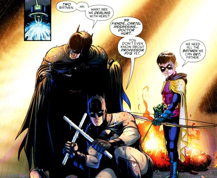 A pesar de establecer su propia identidad como su propio héroe, Nightwing ha tenido que reemplazar a Batman en más de una ocasión. Después de los eventos de la historia icónica de “Knightfall”, asumió temporalmente el papel durante los eventos de Batman: pródigo por Chuck Dixon, Doug Moench, Alan Grant, Graham Nolan, Lee Weeks, Phil Jimenez, Bret Blevins, Ron Wagner y Mike Gustovich antes de que Bruce Wayne volviera al papel a tiempo completo. No adoptaría por completo la identidad de Batman hasta años después de la aparente desaparición de Bruce Wayne a manos de Darkseid en Final Crisis por Grant Morrison, JG Jones y más. Durante este tiempo, entrenó a Damian Wayne como el nuevo Robin, formó una nueva versión de la Liga de la Justicia y se enfrentó a pícaros de Gotham como Two-Face y el Profesor Pyg. Incluso después del regreso de Bruce, Dick permaneció como el Batman de Gotham durante la formación de Bruce de Batman, Incorporated. Y aunque luego dejó el manto voluntariamente, ha reemplazado temporalmente a Bruce más de una vez en los años posteriores.