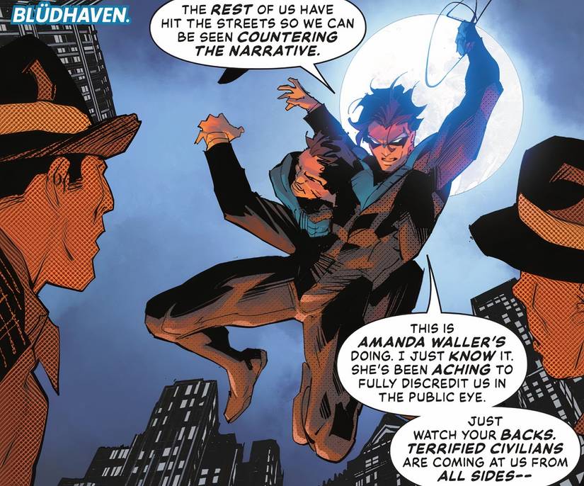 Oracle y Cyborg trabajan juntos para descubrir la fuente de las imágenes manipuladas mientras el resto de los héroes salen a las calles para contrarrestar la narrativa que está elaborando Waller. Nightwing elimina a algunos criminales en Un panel que se parece notablemente a la primera aparición de Batman en la portada de Cómics de detectives #27.