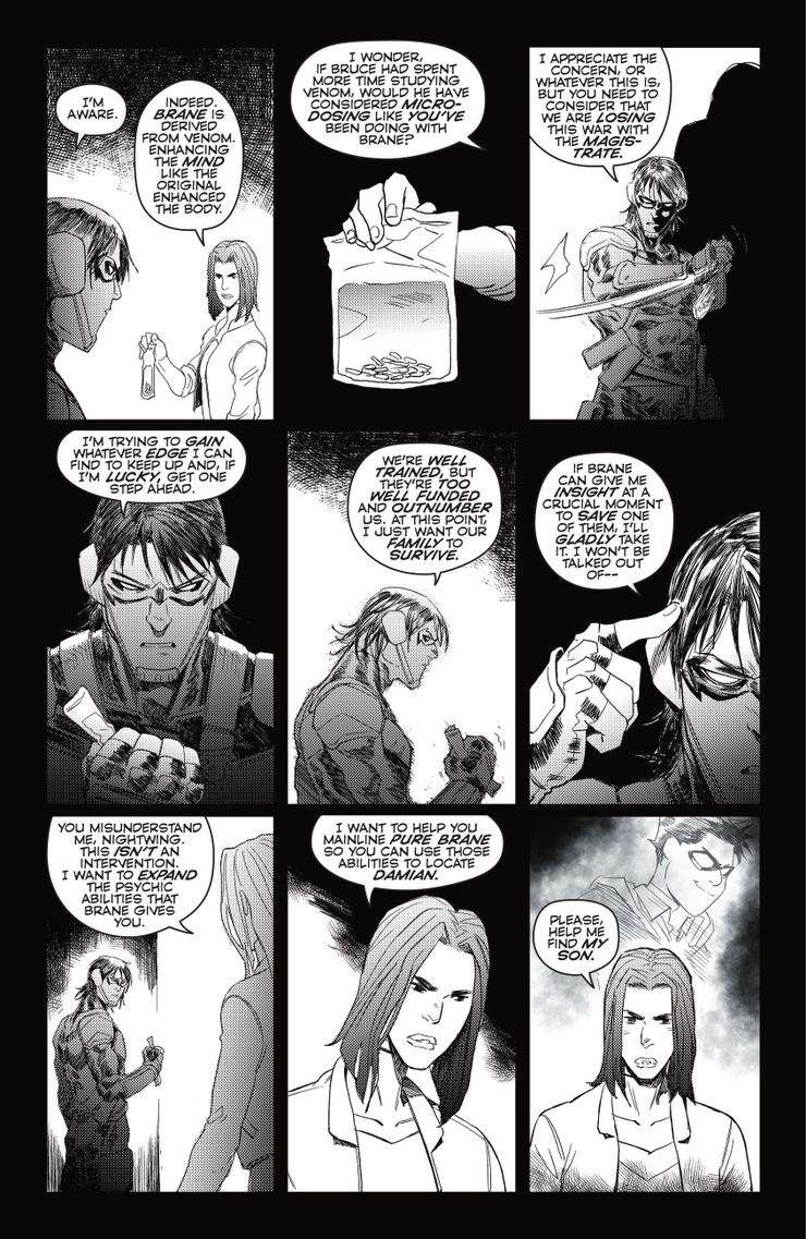 Ahora, en un futuro distópico, Nightwing está considerando tomar un derivado de Venom que le dará una ventaja contra el Magistrado. El número está escrito por Corinna Sara Bechko y Dennis Culver, y está ilustrado por Giannis Milonogiannis. El magistrado fascista se está acercando a Nightwing y a los miembros restantes de la familia de murciélagos. Desesperado, Nightwing recurre a una droga llamada “Brane”, que los lectores aprenden que es un derivado de Venom, pero en lugar de darle fuerza física al usuario, aumenta su poder mental. Talia al Ghul le da a Nightwing un vial de Brane. Él racionaliza su uso diciendo que lo está haciendo para salvar a la familia de murciélagos. Talia le informa a Nightwing que quiere refinar aún más las habilidades que Brane le dará, para ayudar a encontrar a Damian.