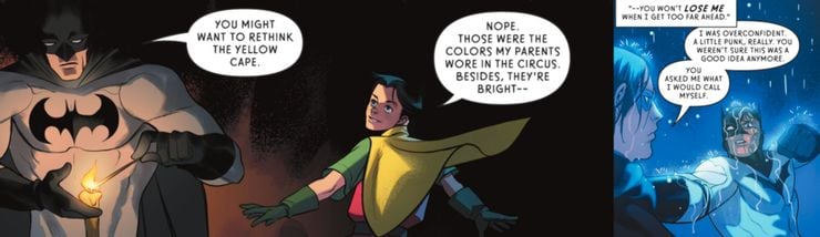 Ahora parece que Dick Grayson está proporcionando una razón por la cual en Petirrojos #6 de Tim Seeley y Baldemar Rivas. Todos los héroes que alguna vez usaron el disfraz de Robin descubren que su pasado regresa para atormentarlos gracias a Jenny Wren, una joven que se desempeñó como “proto-Robin” antes de ser rechazada por Batman. Ella pone en práctica su último plan utilizando tecnología holográfica para convencer a Batman de que su viejo adversario y mentor de Wren, Cormac Dodge, ha regresado de la tumba. Mientras Batman golpea furiosamente a “Dodge”, que en realidad es Tim Drake, los Robin acuden a su rescate e intentan someter a Bruce. Nightwing se queda atrás mientras el resto del equipo se ocupa de Wren, y el ex Boy Wonder intenta llegar a Bruce preguntándole sobre la noche en que se convirtió por primera vez en Robin. Un flashback de la inducción de Robin muestra a Batman criticando la elección de color del disfraz de Dick. El joven héroe dice con aire de suficiencia que los colores no solo honran su pasado, sino que también lo harán más fácil de detectar cuando supere a Batman.