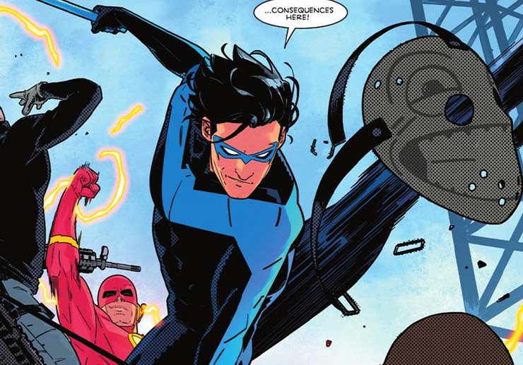 El héroe más inteligente de DC, Mister Terrific, le revela a Dick que ha construido un nuevo disfraz a prueba de balas que puede caber debajo de su ropa de civil. El disfraz es más flexible que nunca, puede resistir ataques peligrosos y también tiene “otras características”. Nightwing regresa inmediatamente a Bludhaven con su nuevo traje y ayuda a derrotar a los soldados de Blockbuster. El traje se ve increíble en acción, ya que presenta el regreso de los dedos rayados de Nightwing.