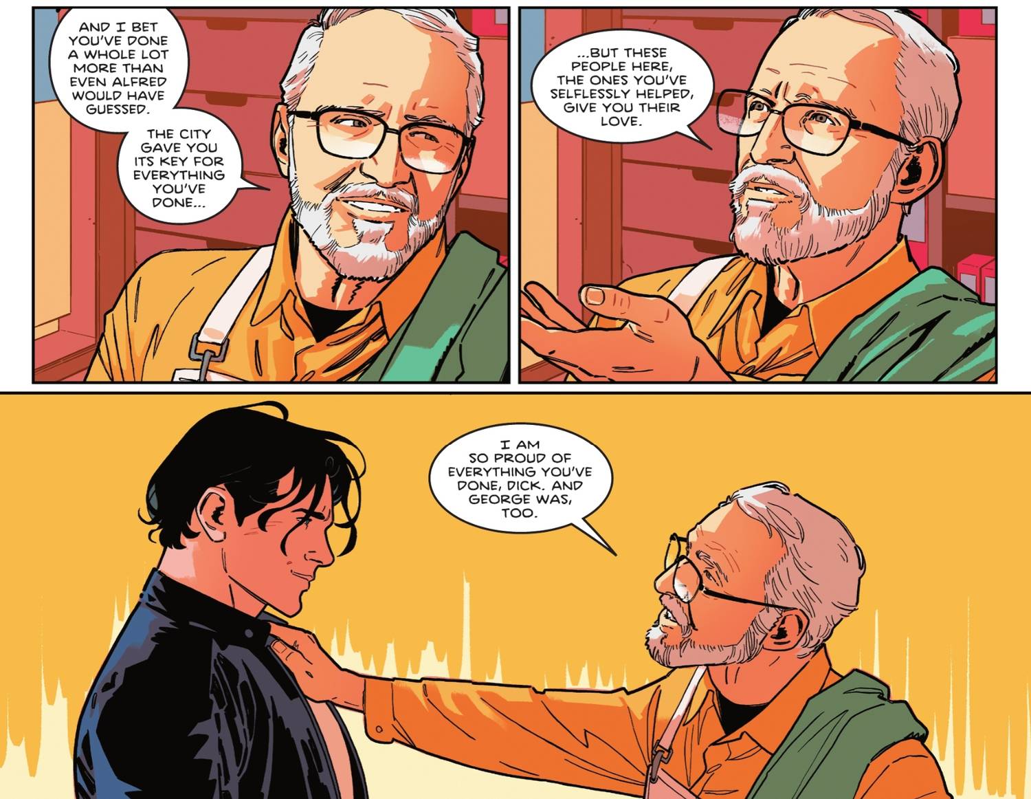 Bastante seguro, Los propietarios titulares se parecen a Marv Wolfman y George Pérez, dos gigantes de la industria que crearon el manto de Nightwing.y el “marv“El personaje se apresura a compartir lo orgulloso que está de quién se ha convertido Nightwing. Esta escena se vuelve aún más conmovedora sabiendo que tiene lugar en la edición número 300 del legado de la Ala noche serie en solitario, una hazaña imposible con la forma del personaje de Wolfman y Pérez.